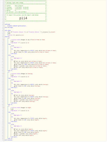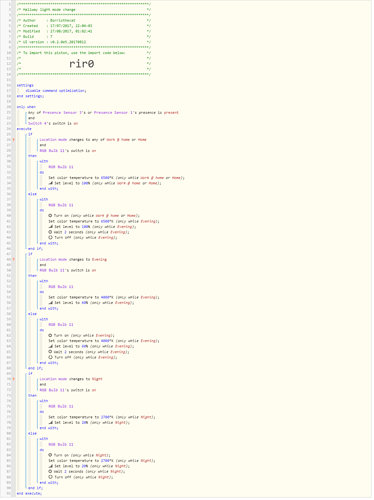 thank you. when the with block at line 37 executes, rgb bulb 11 could be on or off. however, line 40 only turns on the light only when the mode is work @ home or home. then line 41 sets the color temp but only if it is evening.
