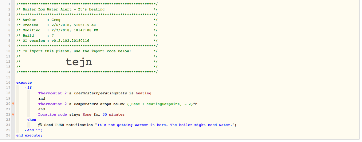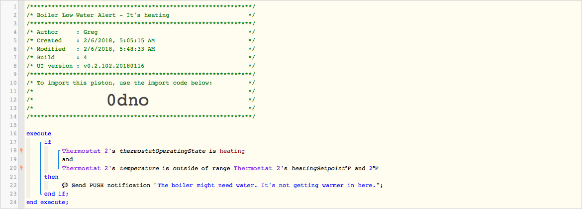 I have steam heat + boiler for my heating system. During the colder months, about once a week, my low water cutoff will shut down the boiler until I refill it with enough water for operation. I get no notification of this. It’s a little orange LED that lights up on the boiler itself. Only way I find out about it is if the house is uncharacteristically cold. It sucks. I’m trying to design a notification using webcore to alert me sooner.
