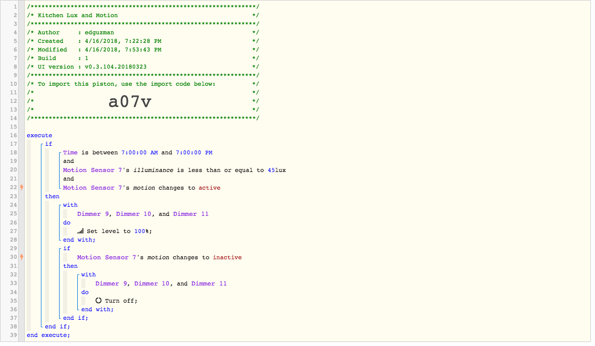 (Would like for kitchen lights to turn on, on a cloudy day only if motion has been triggered and Lux is under 45 between 7 am and 7 pm )