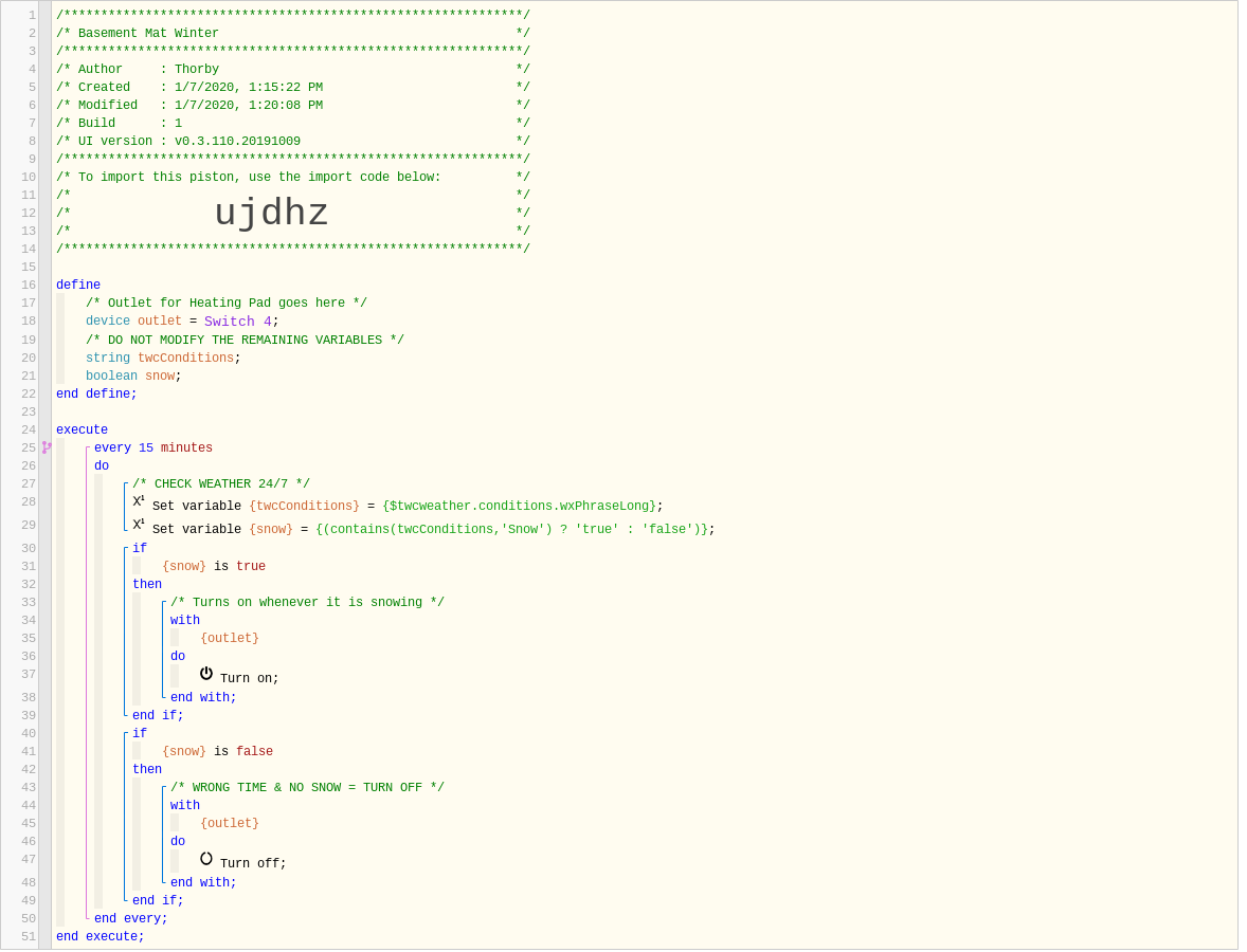 The tricky part is, no $TWC weather occurrence can alert us automatically. We actually have to make a request to see what the current weather is. Here is a piston that runs every 15 minutes, and takes action based on your request: