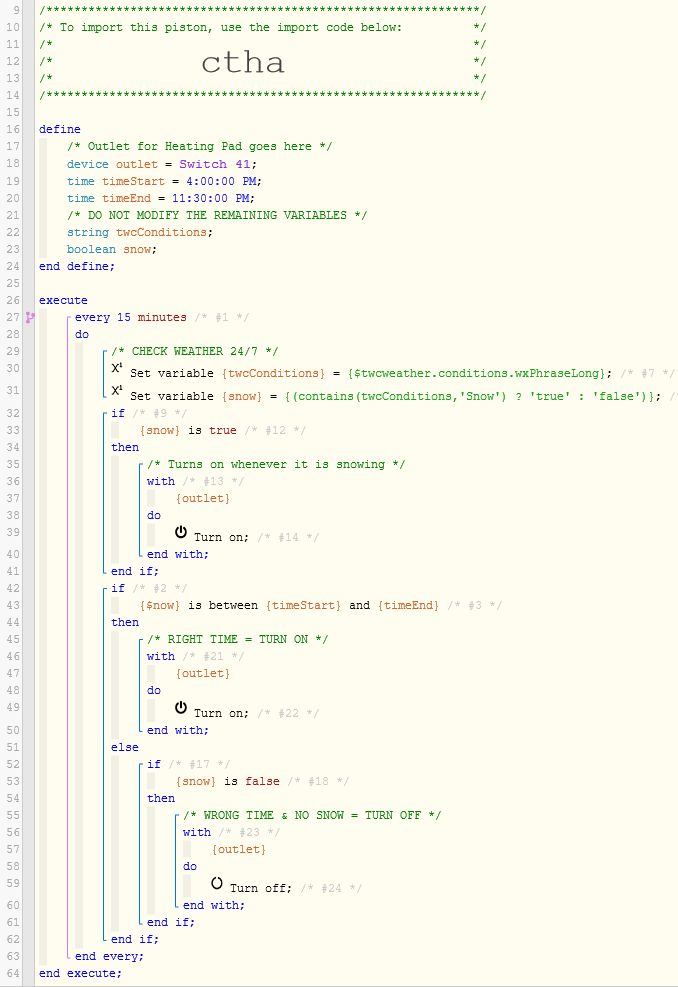 I want a piston that will turn on a switch during a certain time of day, and also if a certain weather event exists. I have a zwave switch that turns on/off an electric socket. Plugged into the socket is a light and a heated mat.