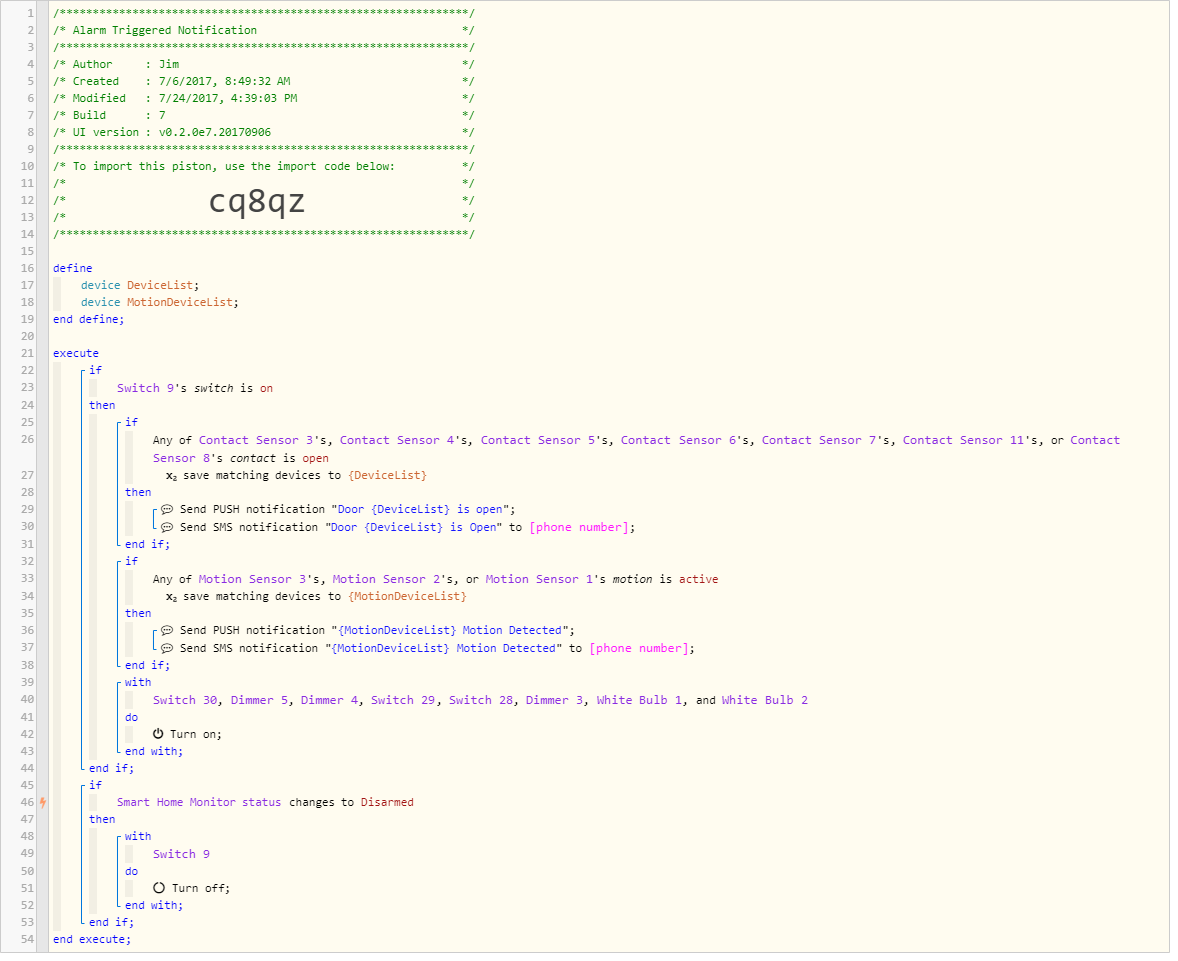 In your case, @Jwwhite, when you have your alarmed tripped it just sends you a text and turns on a light which is the same thing you would get from SHM natively. The only difference is you can perhaps do more with it. The problem with doing more with the piston, such as play something through a sonos speaker, and have it stop automatically when you dismiss a trigger. You would actually have to disarm the alarm and re arm it just to get the speaker to stop playing the tone you set it to play.